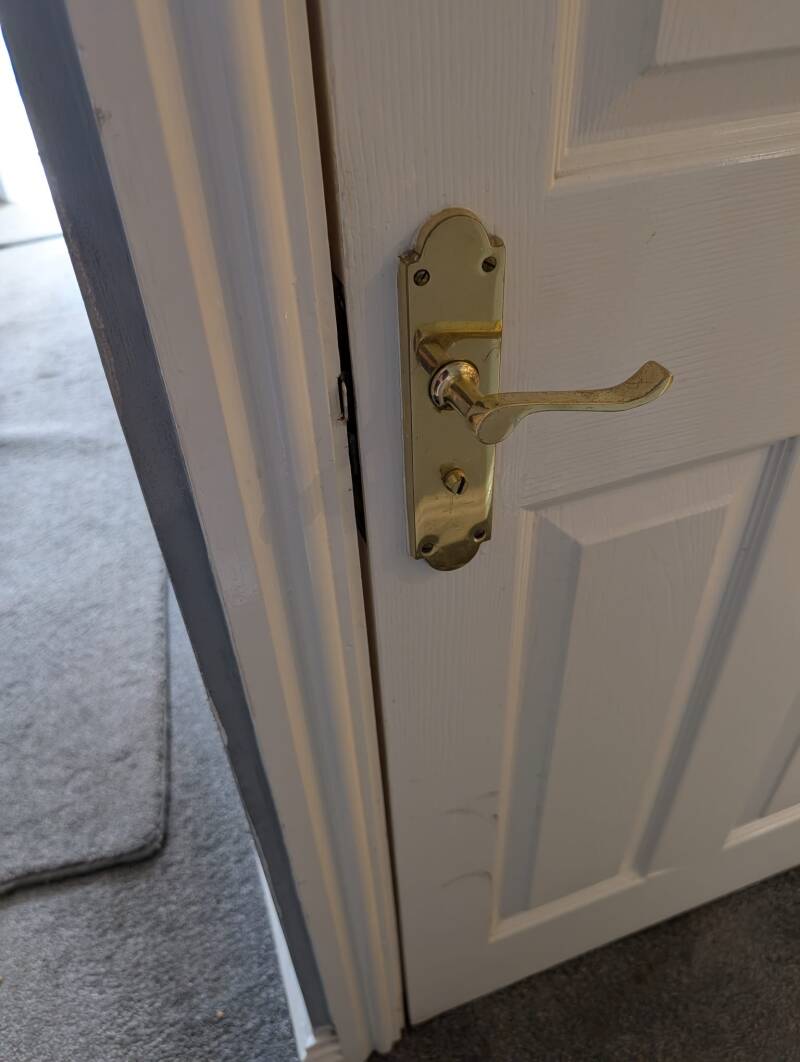 New latch and handles fitted and door trimmed over new carpet.